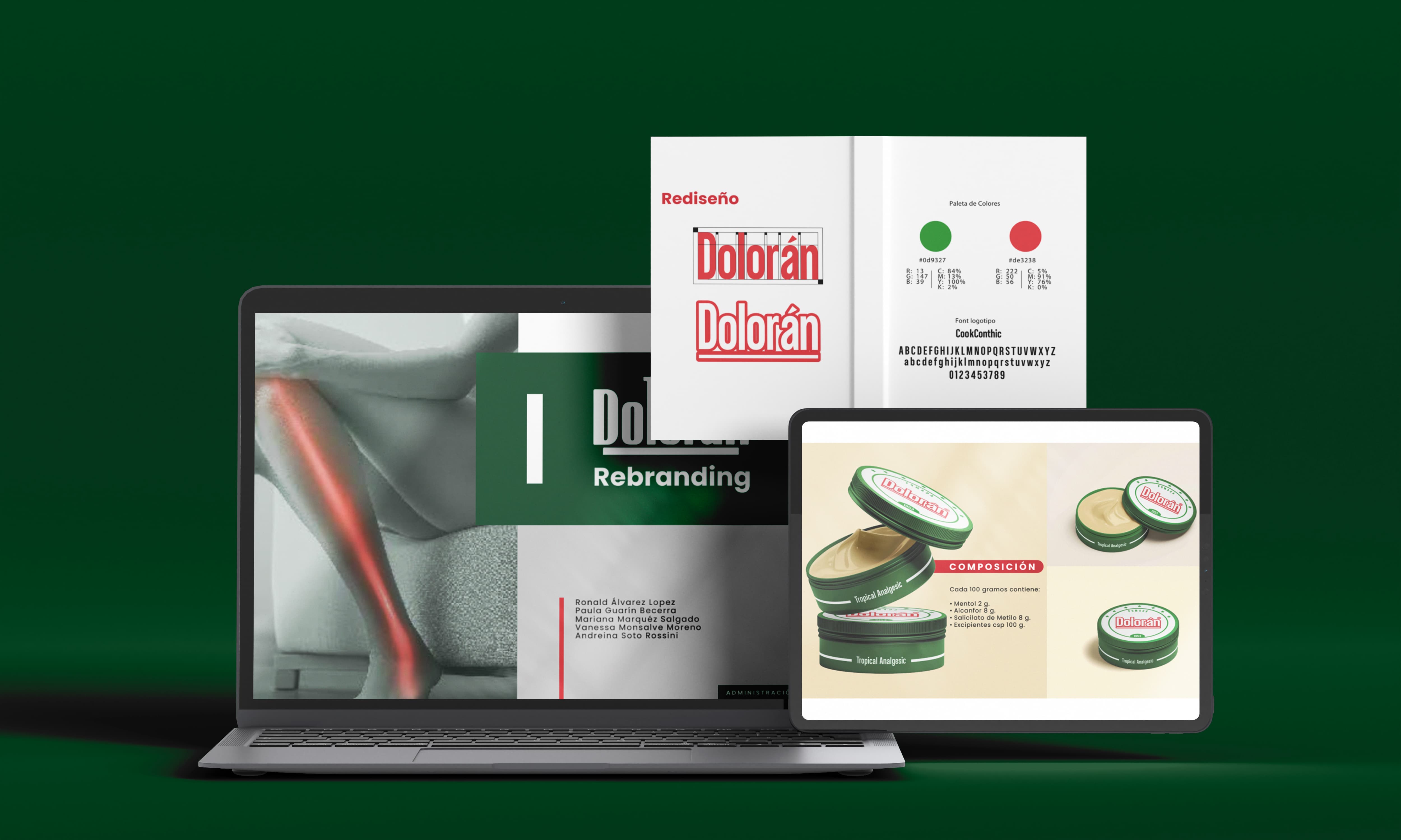 El proyecto de rebranding de Dolorán se enfocó en renovar estratégicamente la identidad visual y el posicionamiento de esta reconocida marca colombiana de pomada analgésica, con más de 70 años en el mercado. A través de un rebranding parcial, se actualizó la imagen manteniendo su esencia tradicional, pero alineándola con las expectativas del público actual, especialmente el segmento entre 30 y 50 años. El proceso incluyó un estudio de mercado y auditoría de marca, seguido por el rediseño del logotipo, la tipografía y el empaque, incorporando elementos como estrellas conmemorativas y una paleta cromática moderna en verde y rojo. Ver proyecto completo